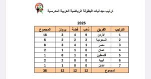 توج المنتخب الأردني بطلاً للدورة الرياضية المدرسية العربي التي أسدل الستار على أحداثها في العاصمة عمان، وحصل طلاب وطالبات المنتخب على “16” ميدالية منها “9” ميداليات ذهبية و”4″ فضة و”3″ برونز، وحل وصيفاً المنتخب السعودي ب”6″ ميداليات بذهبيتين وفضيتين وبرونزيتين، وفي المركز الثالث جاء المنتخب المصري برصيد “8” ميداليات بذهبية و”4″ فضة و”3″ برونز، وفي المركز الرابع جاء الوفد عماني بفضية واحدة، وحل الوفد الفلسطيني خامسا بفضية ، واحتل الوفد الليبي المركز السادس ببرونزيتين وسابعاً لبنان ببرونزية واحدة.