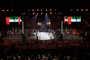 أقام الاتحاد الدولي للملاكمة IBA، حفل افتتاح معبر عن تطور دولة الإمارات العربية المتحدة وثقافتها في رسالة وجهها للعالم بالتزامن مع احتفالات الدولة بـ “عيد الاتحاد 54″، وذلك في حفل افتتاح النسخة الـ 23 لبطولة العالم للملاكمة للنخبة الرجال “الإمارات 2025″، الذي أقامه في استاد سوق دبي الحرة للتنس بدبي، حيث تقام فعاليات البطولة التي تمتد حتى 13 ديسمبر الجاري، وتقدم جوائز مالية قياسية تتجاوز 8 ملايين دولار أميركي.
